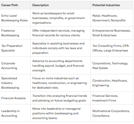Explore career paths for bookkeeping professionals, including accounting, finance, and business.