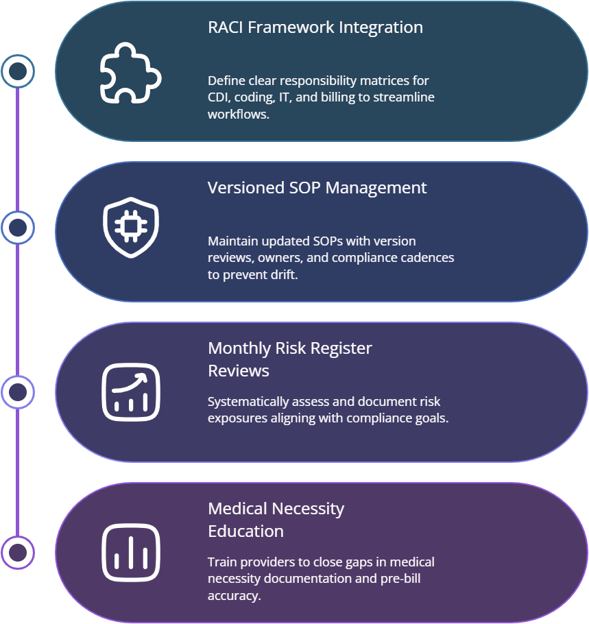 Compliance collapses when roles, SOPs, and evidence trails are vague. Build a governance spine: RACI across CDI, Coding, PFS, and IT; a versioned SOP library with owners and review cadences; and a risk register reviewed monthly. Use provider education to seal medical necessity gaps and prebill edit councils to reduce false positives. Fold in modifier bootcamps sourced from modifier mastery and set remote SLAs leveraging remote-work guides. Maintain refund logs to meet federal 60-day expectations and document AI oversight in line with AI-skills guidance.