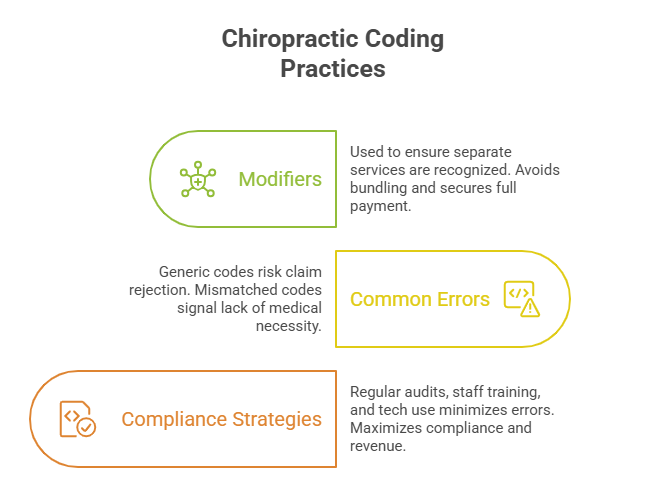 Incorrect or missing modifier use can trigger denials or audits. Therefore, chiropractors must maintain meticulous documentation demonstrating the necessity of services and the context for applying modifiers. Regular training and audits can minimize errors, ensure compliance with payer rules, and safeguard revenue.