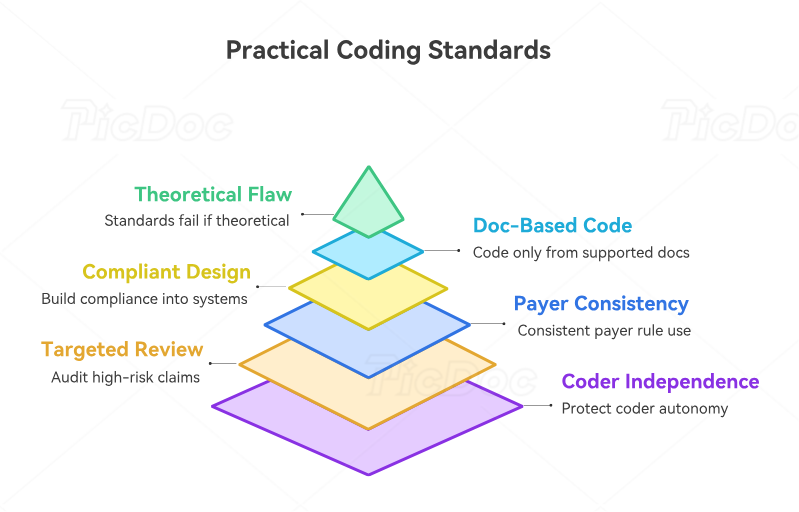 The fifth standard is protect coder independence. A coder should not be punished for declining an unsupported code, requesting clarification, or flagging a risky pattern. The fastest way to destroy ethics is to make accuracy feel career-threatening. The strongest teams do the opposite. They treat principled resistance as organizational protection. When coders know leadership will back accurate decisions even when they slow a claim or challenge a provider habit, standards become real.
