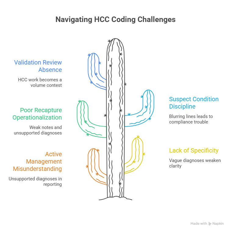 This is where many teams fail. They report diagnoses that were copied forward but never truly addressed. Or they miss diagnoses that were clinically obvious but not documented to the standard needed for coding. Or they let generalized diagnosis language flatten severity, which collapses the patient’s true risk profile. Those misses affect more than one claim. They damage the entire risk picture. Strong HCC performance depends on the same discipline behind CDI programs, medical coding automation oversight, revenue leakage prevention, coding compliance trends, and impact of coding accuracy on revenue.