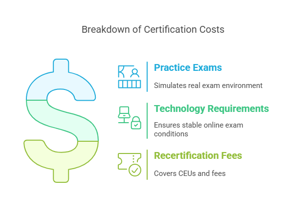 The costs typically include exam fees, study materials, online courses, practice exams, and technology requirements for online exams. There are also costs for maintaining certification through CEUs.