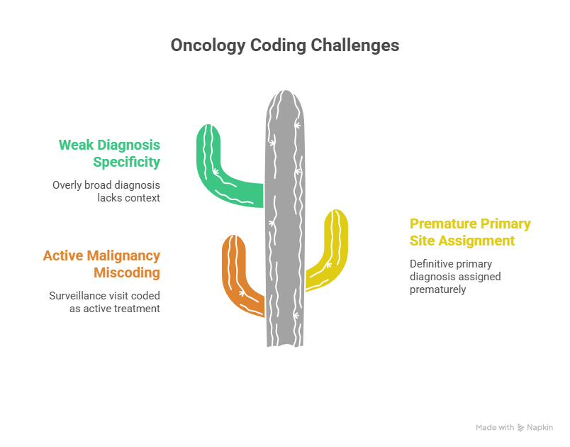| Primary Site | Original organ/tissue where malignancy began | Drives diagnosis specificity, treatment pathway, and payer logic | Confirm pathology + oncologist assessment align before coding |