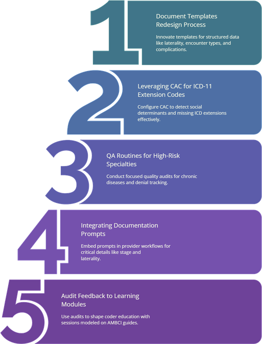 The organizations that saw the biggest reimbursement uplift in our 2025-style study treated ICD-11 accuracy as a system design project, not just coder education. They redesigned documentation templates, pulling structure ideas from the quality assurance guide and audit trails reference, so providers were automatically prompted to document stage, laterality, encounter type, and complication status. CAC and billing tools, introduced in the software solution directories, were configured to flag missing ICD-11 extension codes and social determinants rather than simply mapping ICD-10 favorites.