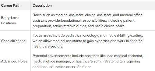 Entry-level positions for medical assistants include medical assistant, clinical assistant, and medical office assistant.