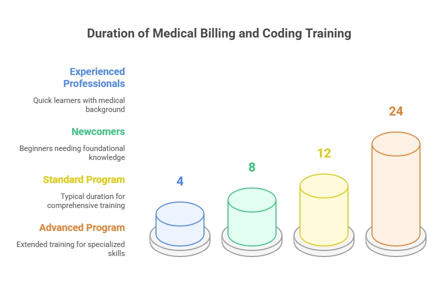 Many aspiring medical billers and coders ask how long it will take to complete their training. The duration of medical billing and coding programs depends on several factors, including the educational route chosen. Training can last anywhere from 1 to 3 years. Those with previous experience in the medical field might complete their training in as little as 4 months, while newcomers may require about 8 months to grasp the essential concepts.