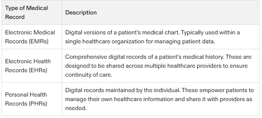 Personal Health Records (PHRs): digital records of an individual’s medical history, maintained by the individual.