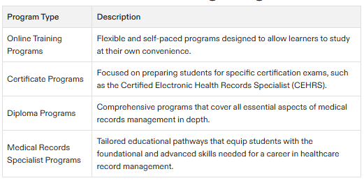 Diploma programs: comprehensive programs that cover all aspects of medical records management.