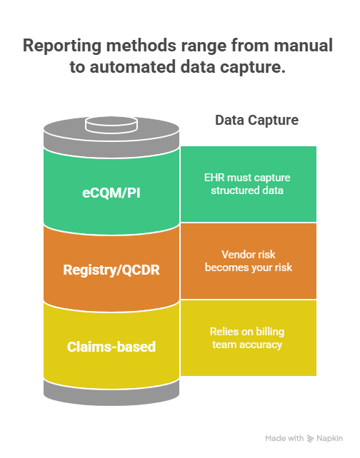 The reporting method you choose controls your risk. The wrong method creates missing data, late submissions, and inaccurate measure logic. The best approach is to pick the method that fits your infrastructure and then build controls around it.