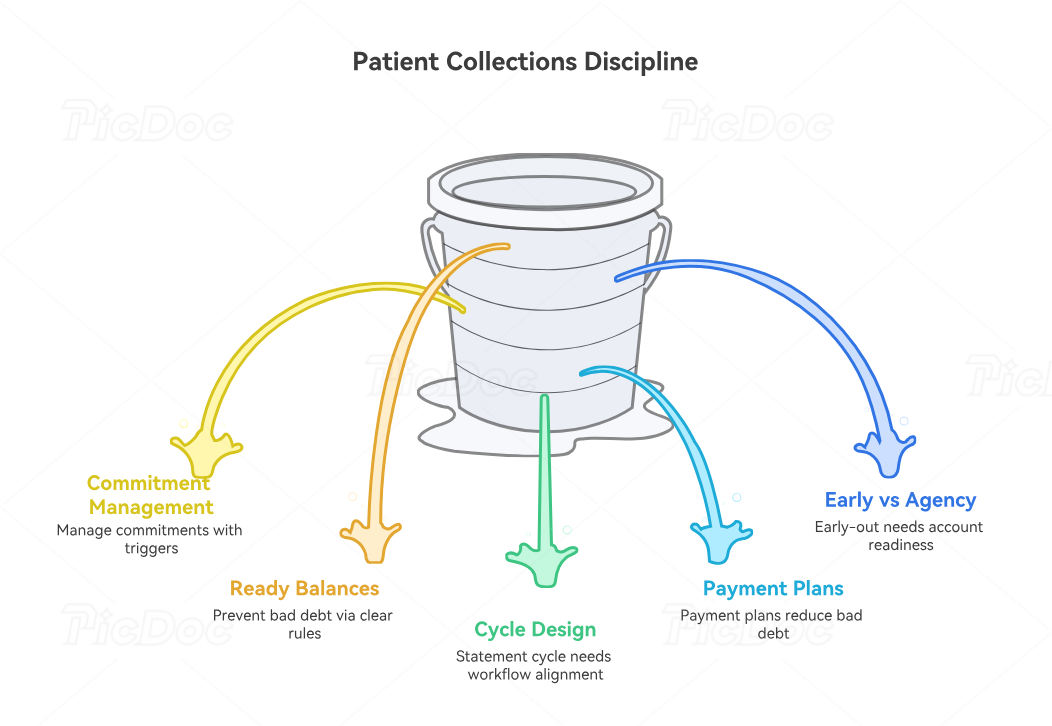 A strong patient collections process is built on workflow discipline, not random follow-up. That is why terms like statement cycle, payment plan, partial payment, promise to pay, early-out, and agency placement matter so much. They define how the organization behaves once a patient balance becomes real.