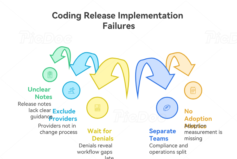 The fifth failure is failing to measure adoption. Leaders often ask whether the update training happened. The better question is whether behavior changed. Did coders shift to the new code set correctly? Did denial rates improve or worsen? Did providers supply the missing specificity? Did edit overrides drop? Did rework volume rise? Without that measurement, implementation becomes a checkbox exercise instead of a performance discipline.