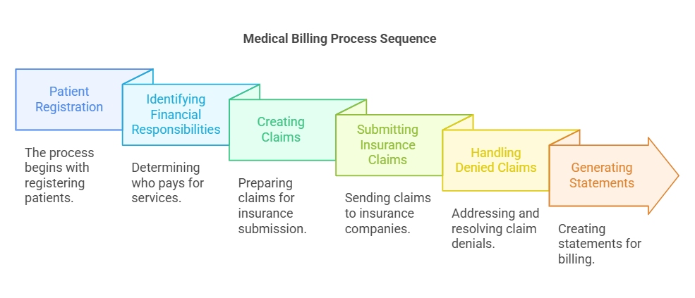 The medical billing process begins with patient registration and ends when all bills are paid. The process includes identifying the financial responsibilities of patients, creating claims, and generating statements. Medical billing specialists must maintain precision at each stage to ensure regulatory compliance. Electronic Health Records (EHR) systems and medical billing software streamline this process by facilitating data management and improving communication, reducing the chances of errors.