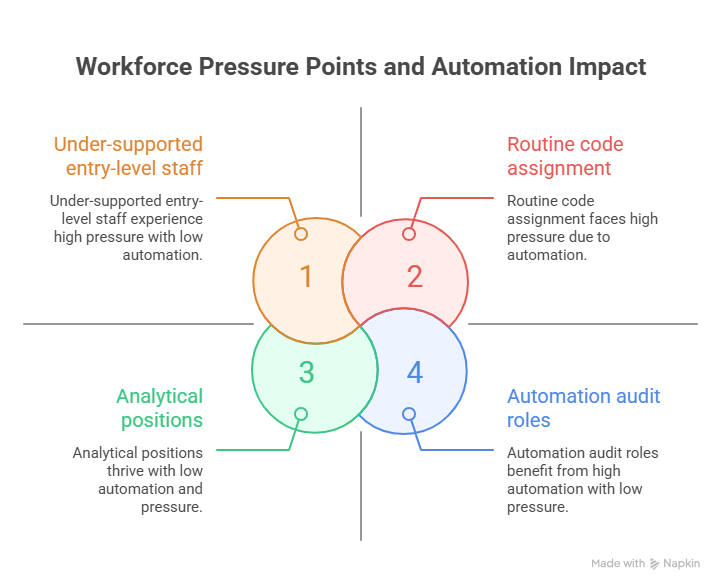 Burnout remains a defining demographic force. High denial volumes, constant payer policy changes, and aggressive productivity quotas accelerate turnover, especially among under-supported entry-level staff. Studies referenced in coding denials management analysis consistently show that teams without senior mentorship not only experience higher error rates but also lose talent faster due to stress, rework, and lack of career clarity. Over time, this creates a costly cycle where inexperienced replacements amplify denials instead of reducing them, which is exactly how organizations end up bleeding money through hidden revenue leakage and repeatable common medical coding errors.