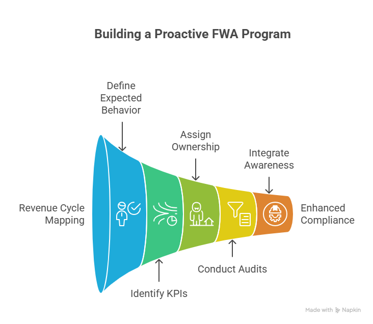 A serious FWA program doesn’t start with a policy manual; it starts with data, education, and governance. First, map your entire revenue cycle from scheduling to bad-debt write-off and overlay known FWA hotspots from the table above. For each point, define: what is the expected behavior, which KPI will signal deviation, and who owns remediation. Use benchmarks from RCM efficiency reports, reimbursement rate analyses, and revenue leakage studies to set realistic thresholds.